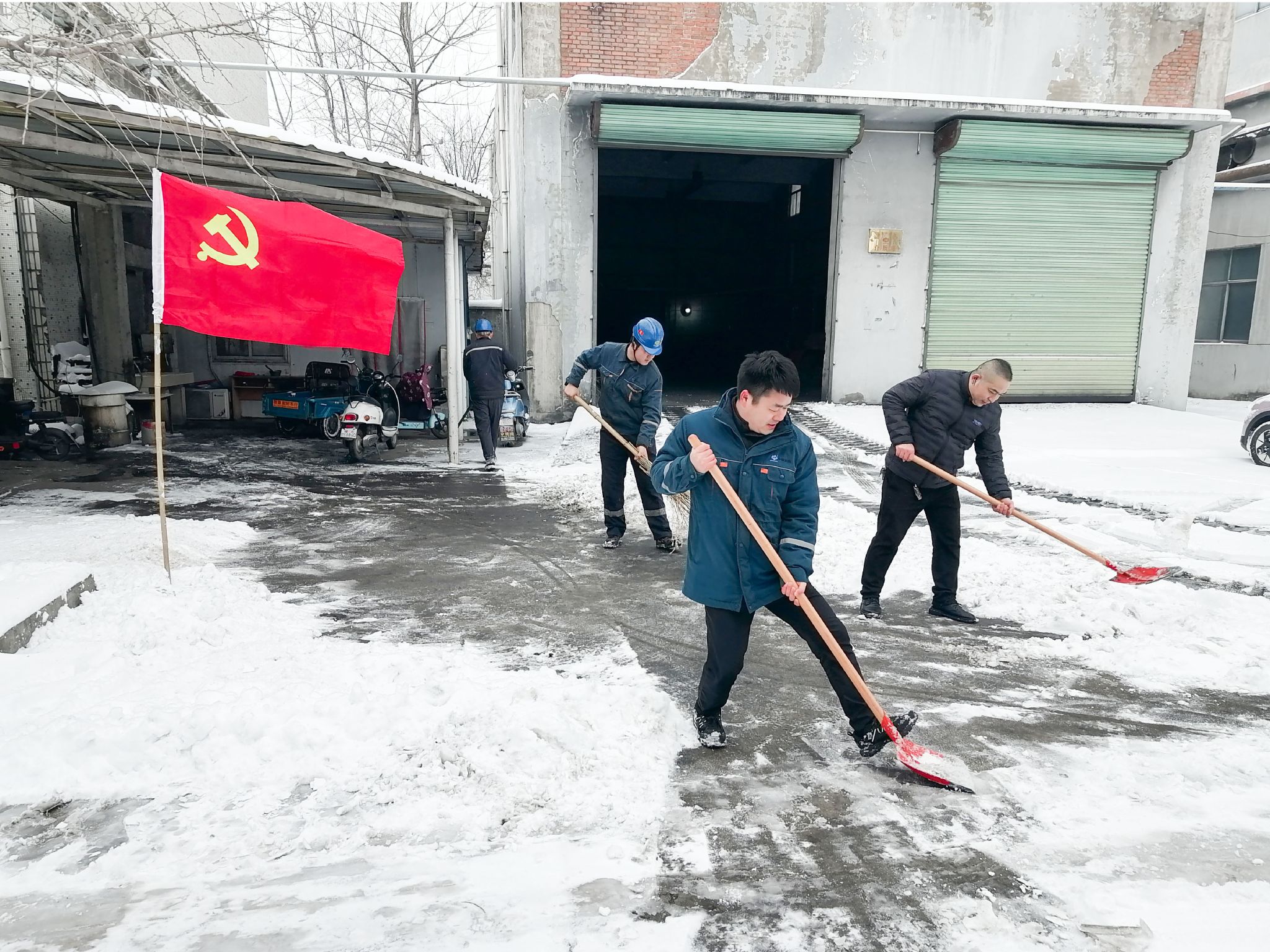 行动伊始,党支部发出倡议,号召全体党员干部发挥先锋模范作用,带头冲锋在前,以实际行动践行初心使命。活动现场,大家分工明确、配合默契,形成了“党员带头干、青年跟着上、党群齐发力”的火热场景。党员干部们冲锋在前,挥舞着铁锹铲除坚硬的冰层,用扫帚清扫路面浮雪。青年志愿者们充分发挥不怕苦、不怕累、不怕冷的奋斗精神,有的负责清运积雪,有的协助清理边角区域,有的提醒过往职工注意防滑,用细致周到的服务传递着温暖。