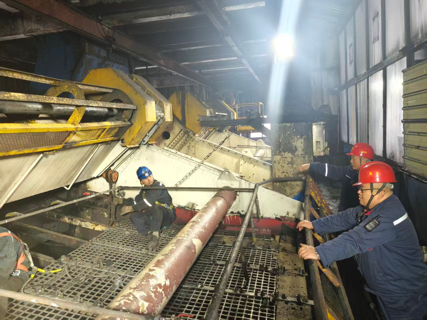 检修前期,该厂成立专项工作小组,组织技术骨干对设备运行数据进行全面分析,精准梳理出振动筛筛梁老化、刮板机轴承磨损、跳汰机传动故障等10余项重点检修任务,制定详细作业方案与预案措施。检修期间,全体参检人员协同攻坚,严格遵循安全操作规程和质量标准。安全、技术人员紧盯关键工序,对振动筛大梁进行拆解、更换与精度校准,对输送系统皮带进行全线检查、接口修复与张力调整,同步完成了动筛跳汰设备升级、管路防腐除锈、电气控制系统优化等10余项技改项目。