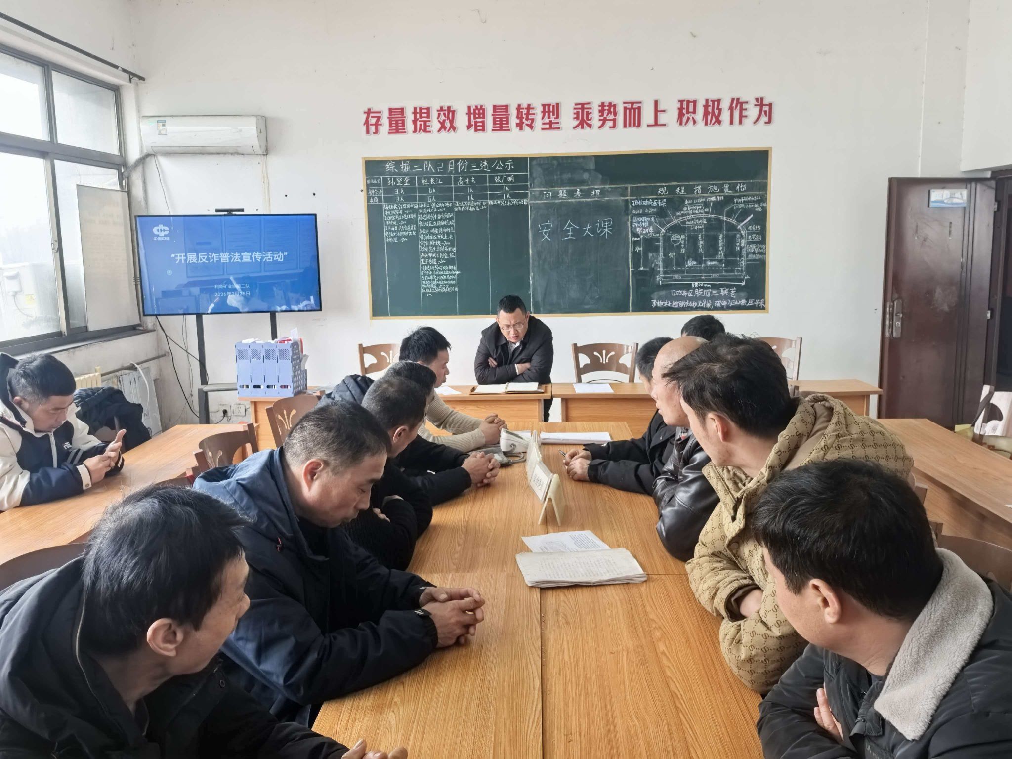 针对煤矿职工工作环境特殊、与社会信息相对脱节的特点,综掘二队充分利用班前班后会及安全例会学习时间,开展了立体化的宣教。通过微信群学习了近期高发的“虚假投资”“网络刷单”“冒充熟人”及“虚假贷款”等真实案例,通过以案说法揭露诈骗分子的作案手法和话术套路。同时依托会议室电子学习屏滚动播放反诈宣传视频,直观展示电信诈骗的危害性。