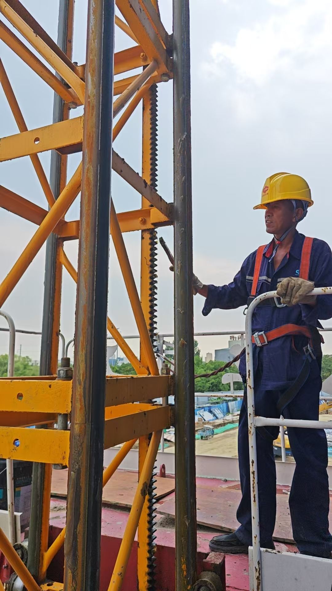 上午11点多,正在055项目物料提升机维保的安拆师傅们正在紧张有序地忙着检查钢结构、传动系统、安全装置、附墙装置、电气系统、绳轮系统等部件。安拆师傅白春秀即是既是安拆作业人员,又是带队党员安监员,正在检查结构件有无扭曲、变形、裂纹和严重锈蚀等,安全帽下垫着毛巾,每半个小时喝掉一瓶水,被汗水全身湿透的背影正坚定认真地旋转着扳手。他腼腆地笑着说:“晒脱皮不算啥,要是设备不能正常运行了,那才是砸招牌!”