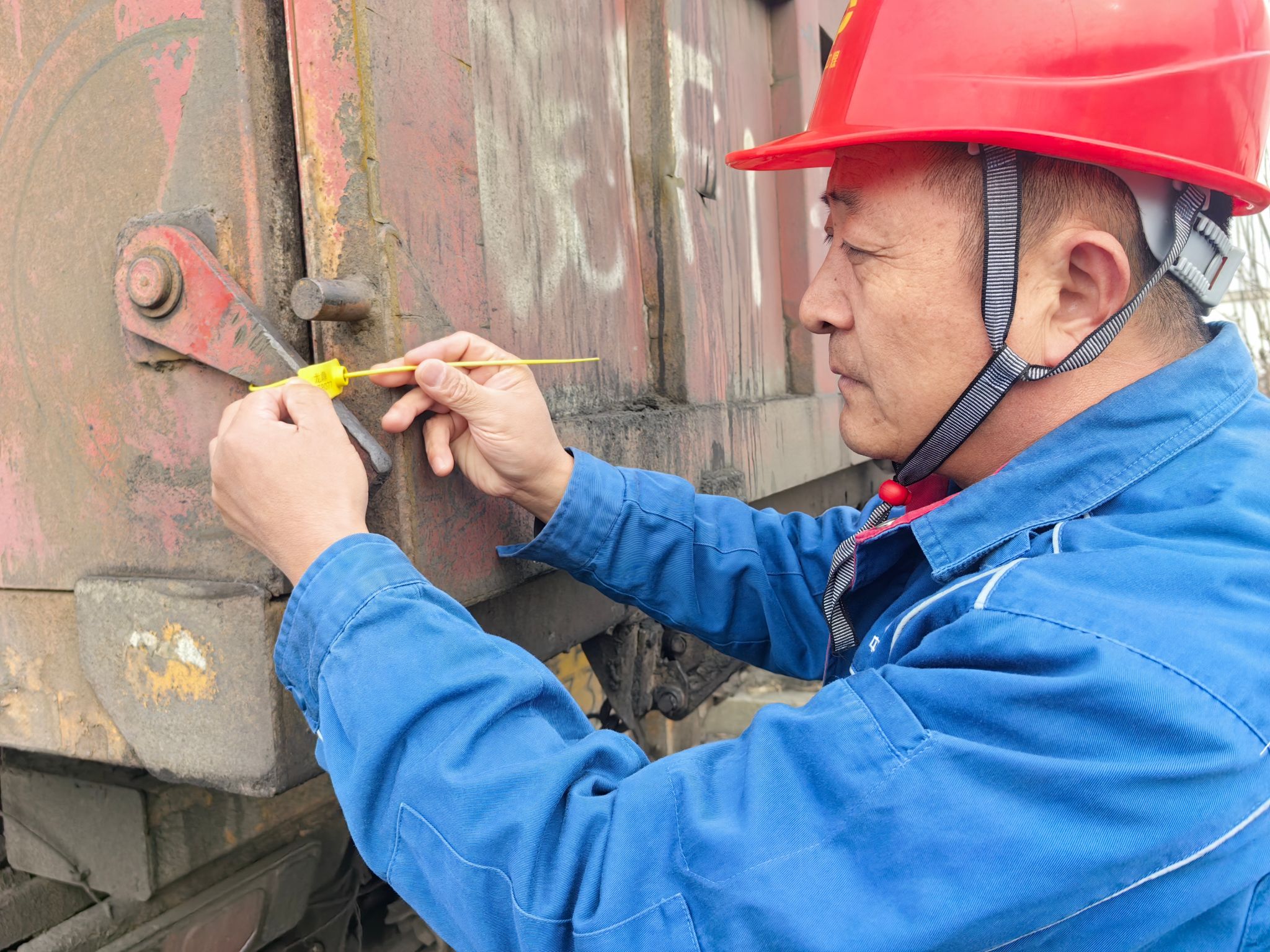 滁州运煤现场,运煤负责人杨东,在刺骨的寒冷天气中手持封签条,伫立于运煤车辆旁,对到货车辆进行技术检查。这里日均技检运煤载重车约100辆,每天载运量约8千吨煤炭。杨书记的脸冻得通红,检车封条却来回翻转得很轻盈:“再隐蔽的故障和问题,也逃不过我们的眼睛。”